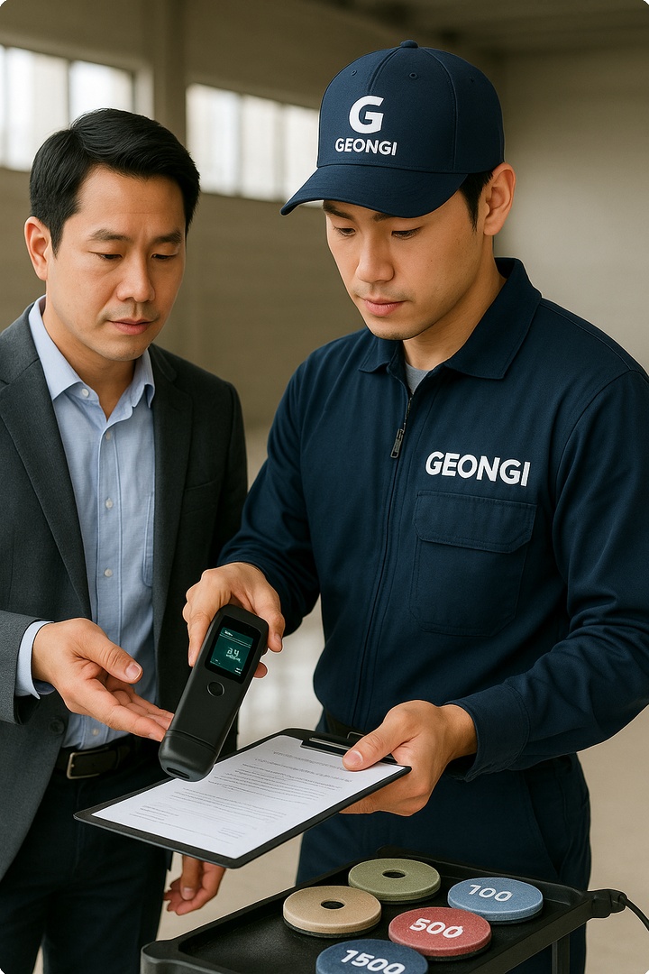 완벽한 폴리싱의 기초가 되는 표면 준비 작업입니다. 크랙 보수, 오염물질 제거, 표면 정리를 통해 최상의 바닥 상태를 만듭니다.